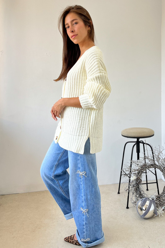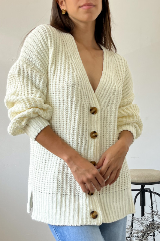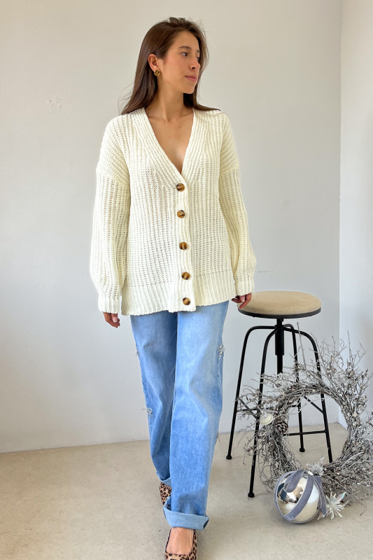 Abrigo corte relajado en tejido de punto ancho con escote V y botones en contraste al frente.