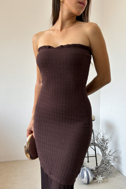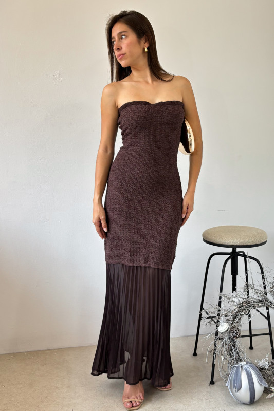 Maxi vestido en corte semiajustado; parte alta strapple en tejido de punto strech y parte baja en pastelones de chiffon.