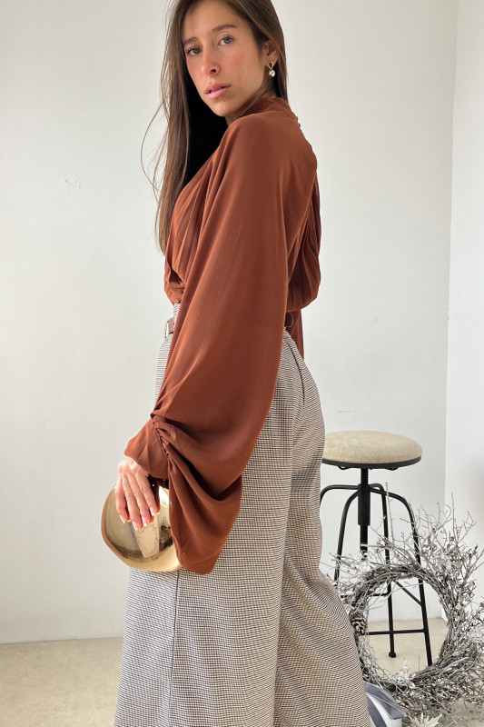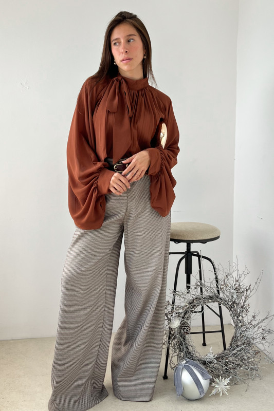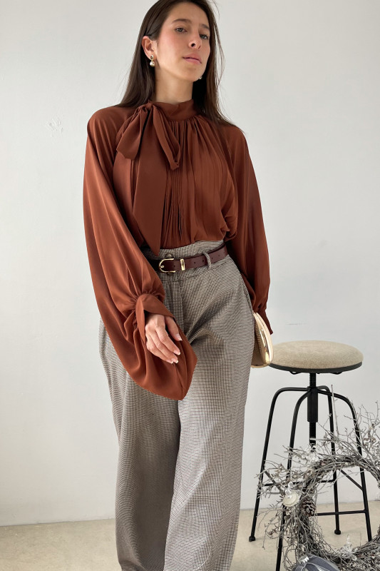 Blusa corte relajado en chiffon ligero con detalles de tableados al frente y en espalda, mangas tipo globo, puños anchos con botones de media perla y cuello cerrado con corbatero en misma tela.