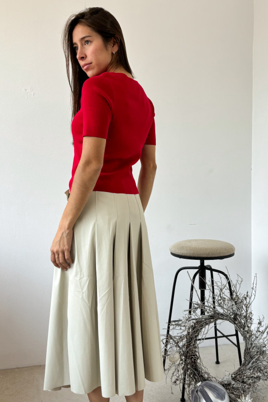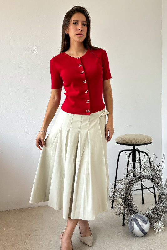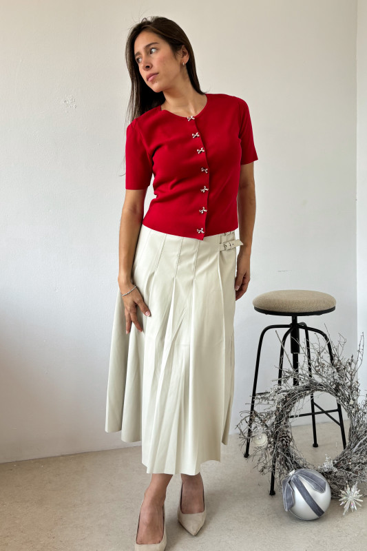 Blusa en tejido de punto fino en corte semiajustado, manga corta y botones plateados en forma de lazos metálicas.