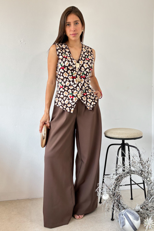 Chaleco en tejido de punto fino en animal print con cerezas y aplicaciones de botones dorados al frente.