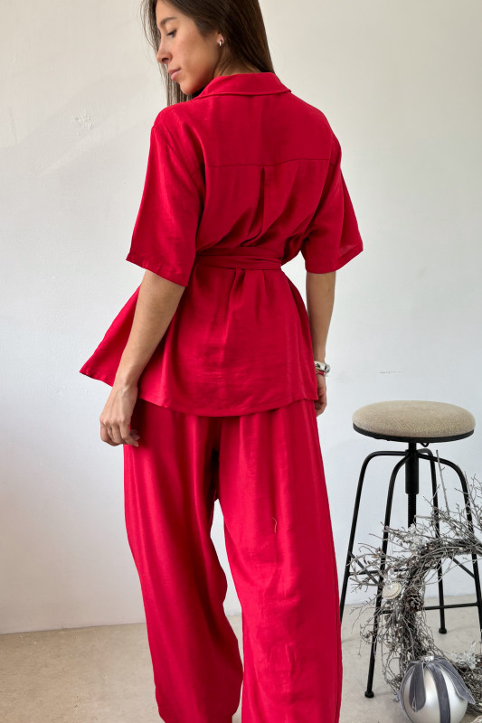 Set en dos piezas en tela ligera, blusa corte relajado con cuello ancho y bolsa, botones plateados y cintillo ajustable en misma tela; maxi pantalón en corte relajado con elástico en cintura y bolsas laterales.