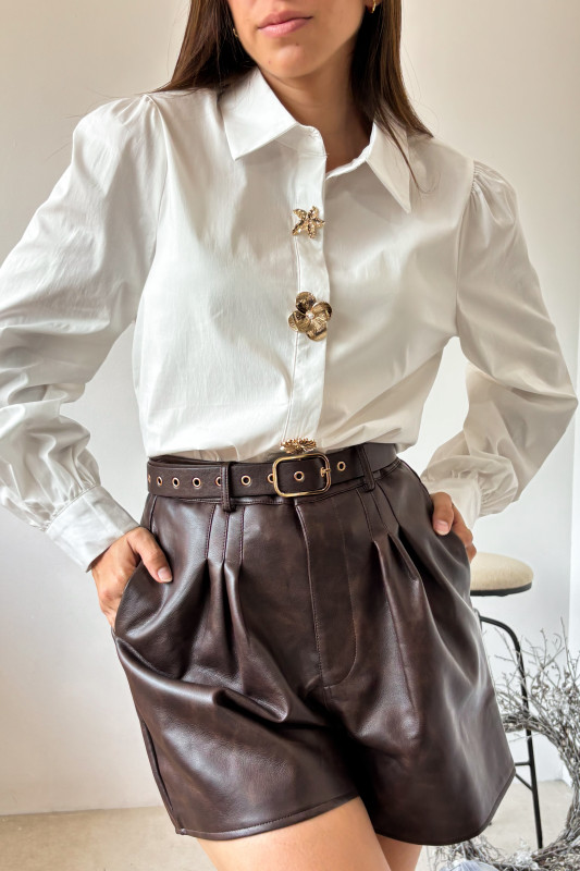 Short tiro alto en vinilpiel con desgastes, cinturon en mismo material con hebilla dorada y bolsas laterales.