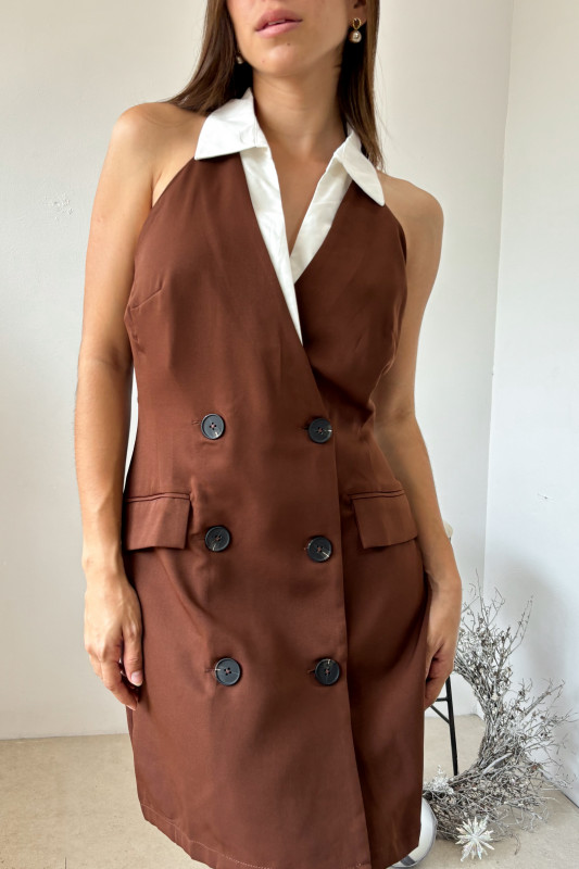 Vestido corto en corte semiajustado con efecto envolvente y contraste en cuello .