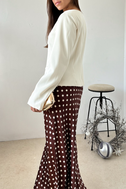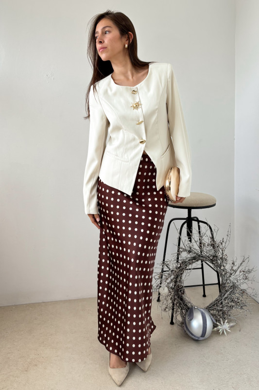 Saco en corte semiajustado con botones dorados al frente, forro interior y apertura alta en abdomen.