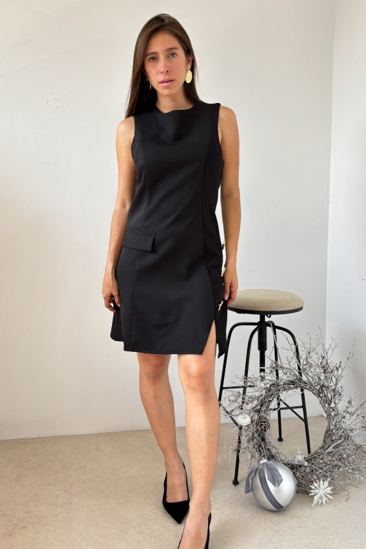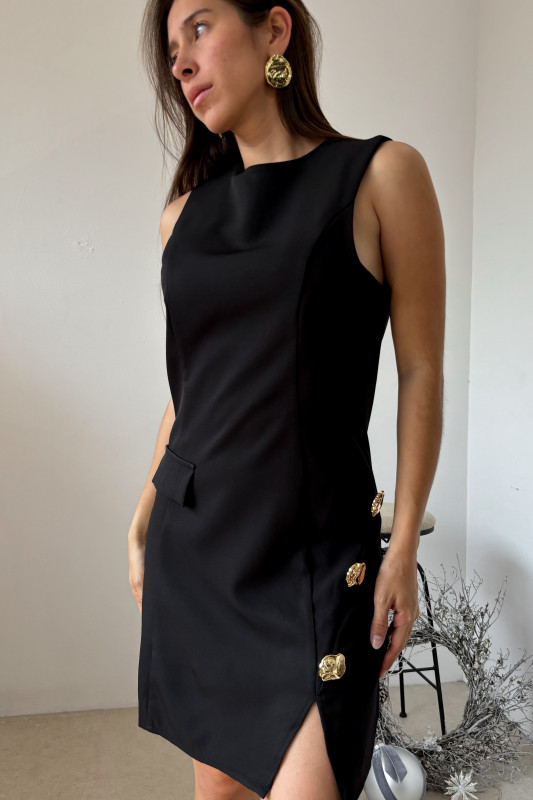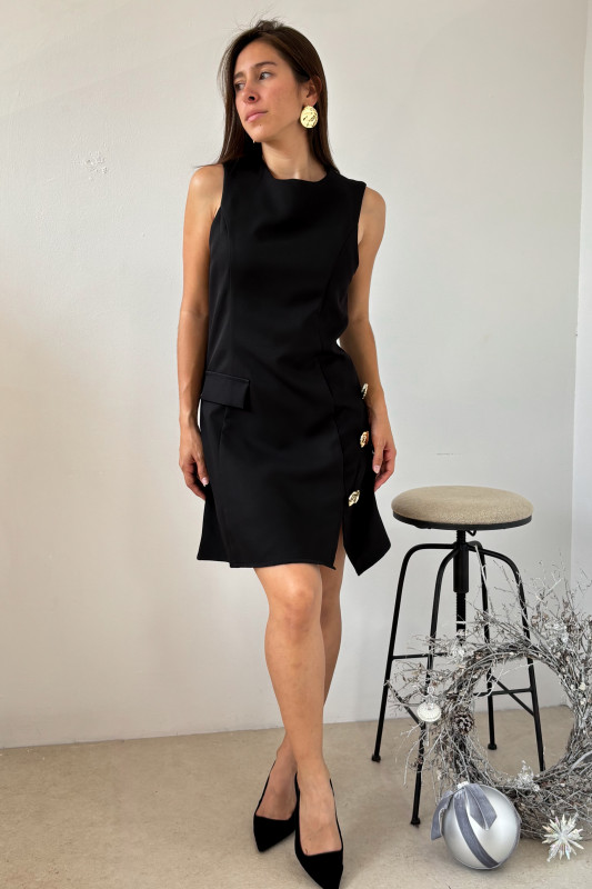 Vestido corto, en corte semiajustado con botones dorados en lateral y simulación de bolsa.