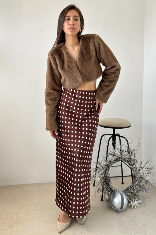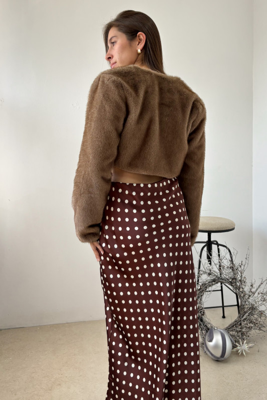 Abrigo corto tipo torera en fur color café oscuro.
