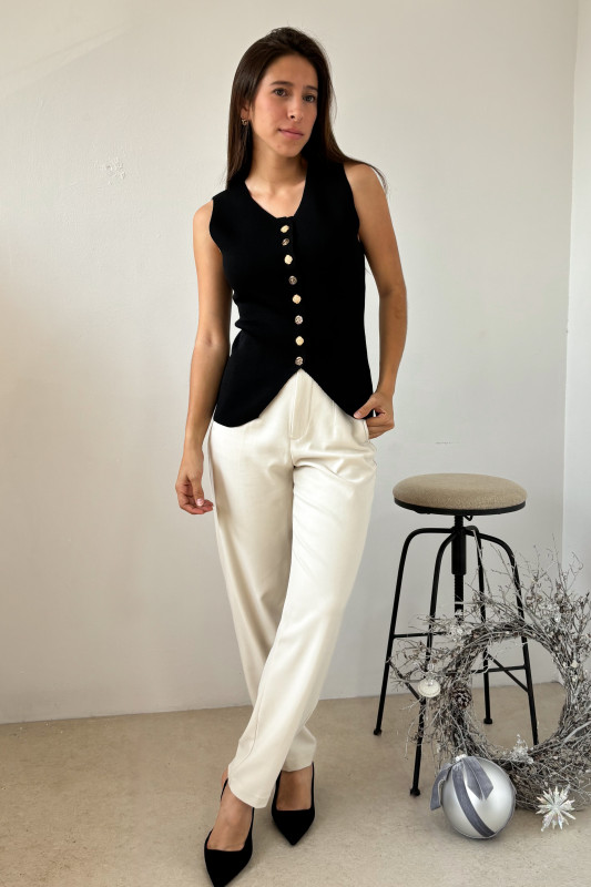Chaleco en tejido de punto fino, corte semiajustado con botones variados en acbado metálico con brillantes.