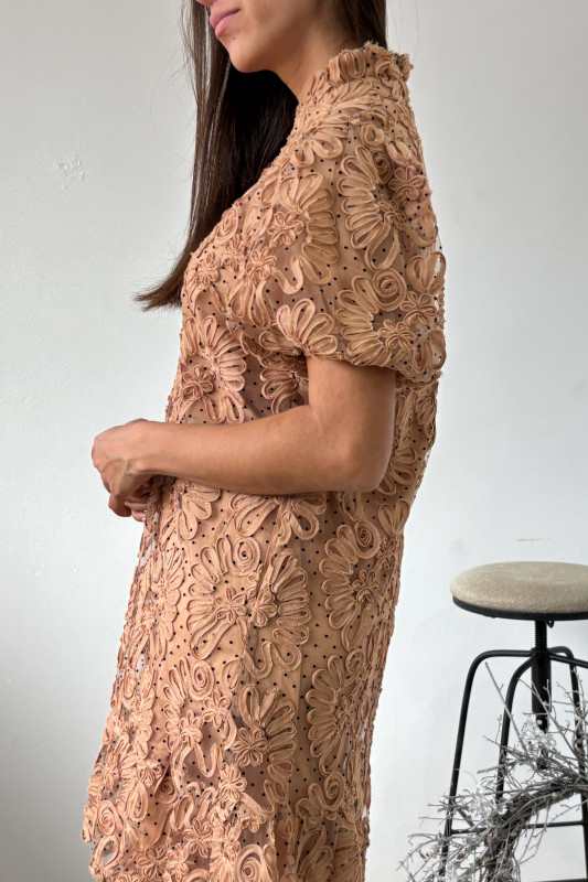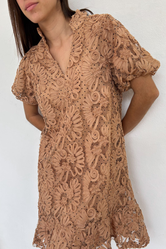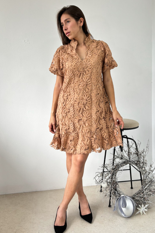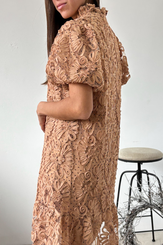 Vestido corte batita en doble tela con organza y bordados de listón con contraste de lunaes negros, mangas tipo globo, cuello alto y bolsas laterales.