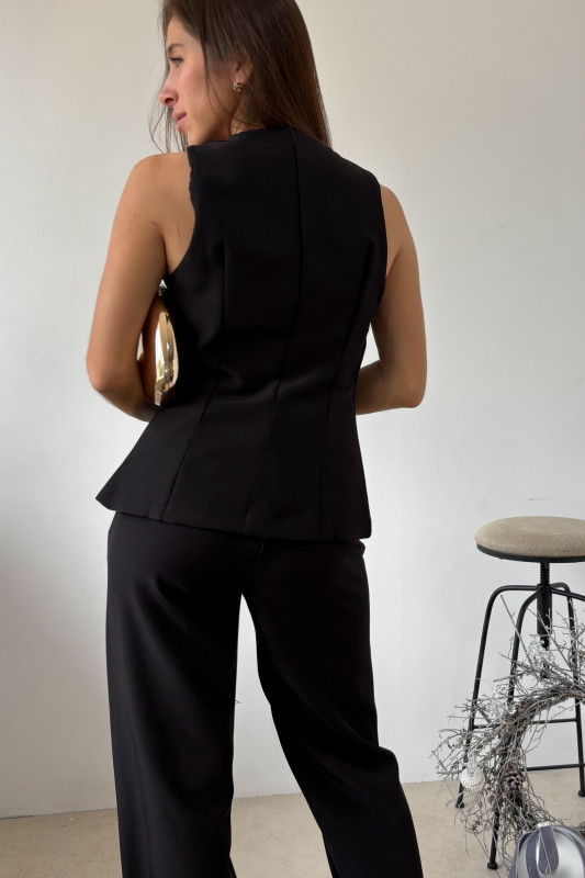 Set en dos piezas, chaleco en corte semiajustado con escote V y botones en forma de flores resaltadas, pantalón recto con tiro alto y bolsas laterales.