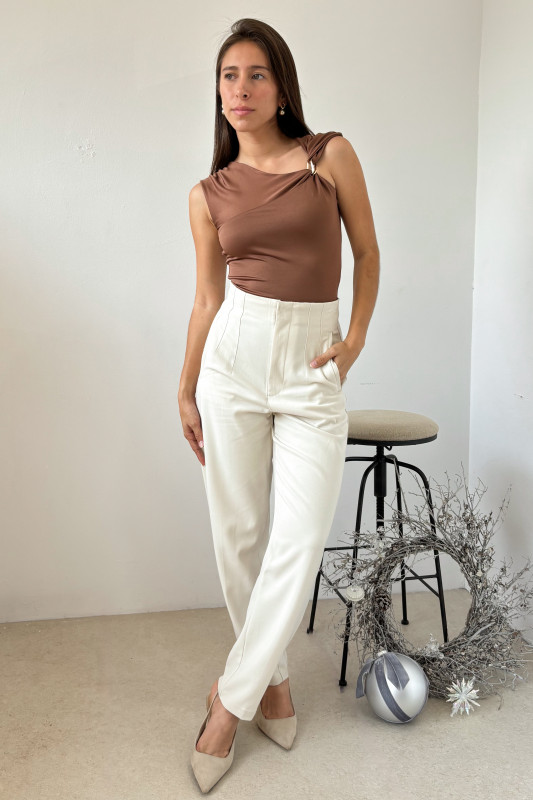 Pantalón tiro alto en corte semiajustado con pinzas al frente y bolsas laterales.