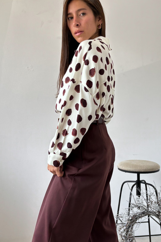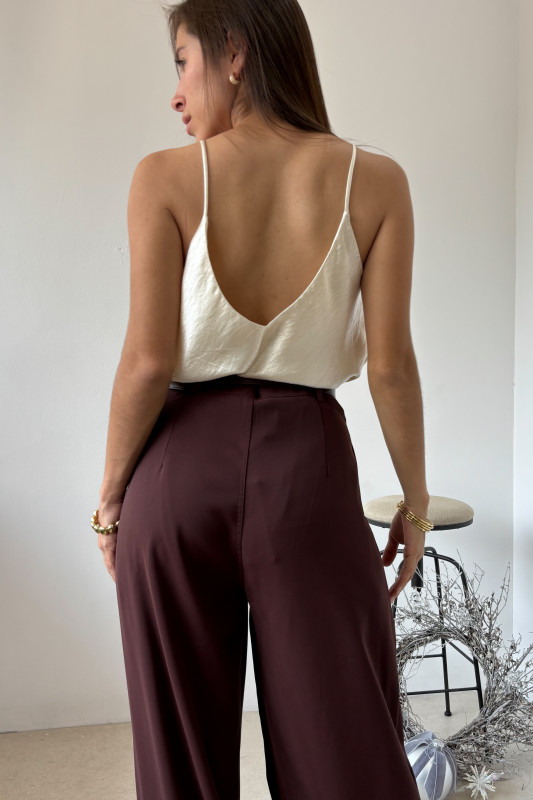 Maxi pantalón formal con piernas anchas, tiro alto pretina ancha y cintillo con hebilla metálica.