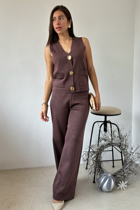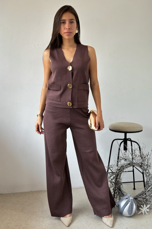 Set en dos piezas en tejido de punto fino, chaleco corte relajado con bolsas al frente y botones dorados, pantalón corte semiajustado con elástico oculto en cintura.