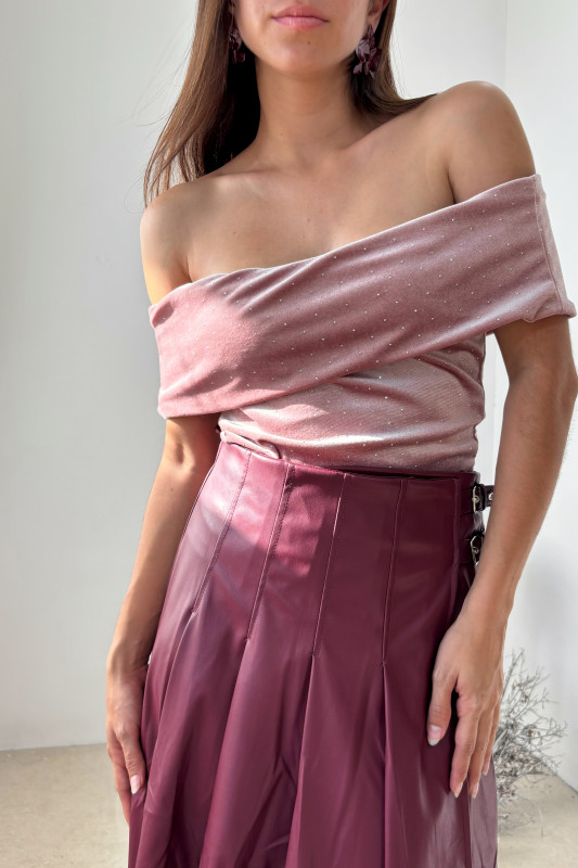 Blusa corta en terciopelo strech con aplicaciones de brillantes, escote de hombros descubiertos.