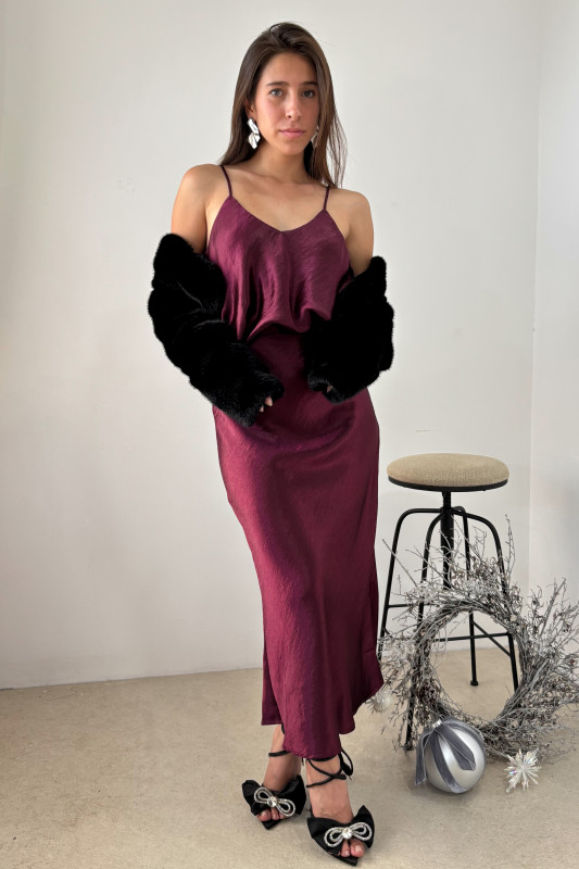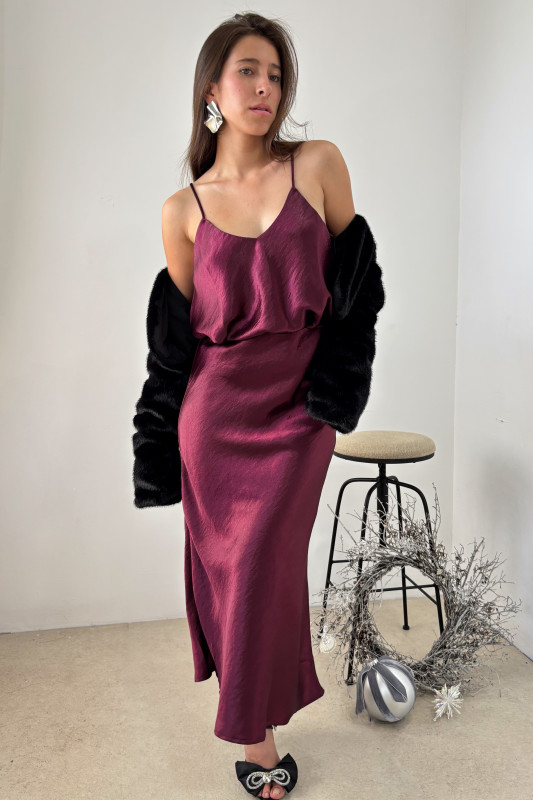 Falda midi en satén ligero, corte semiajustado con elástico oculto en cintura.
