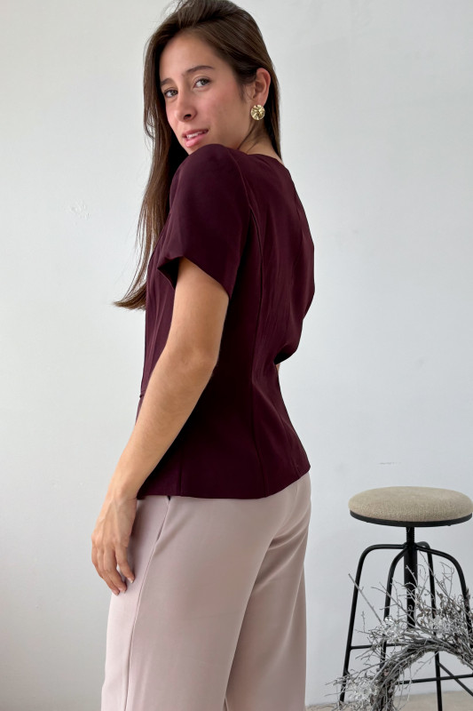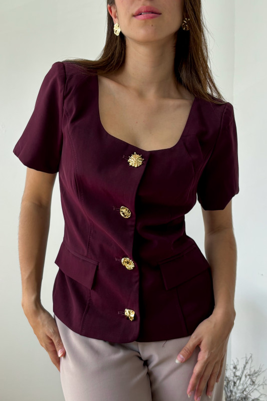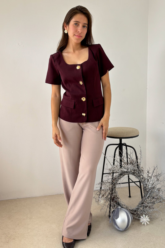 Blusa corte semiajustado con escote cuadrado, falsas bolsas al frente y botones dorados al frente.