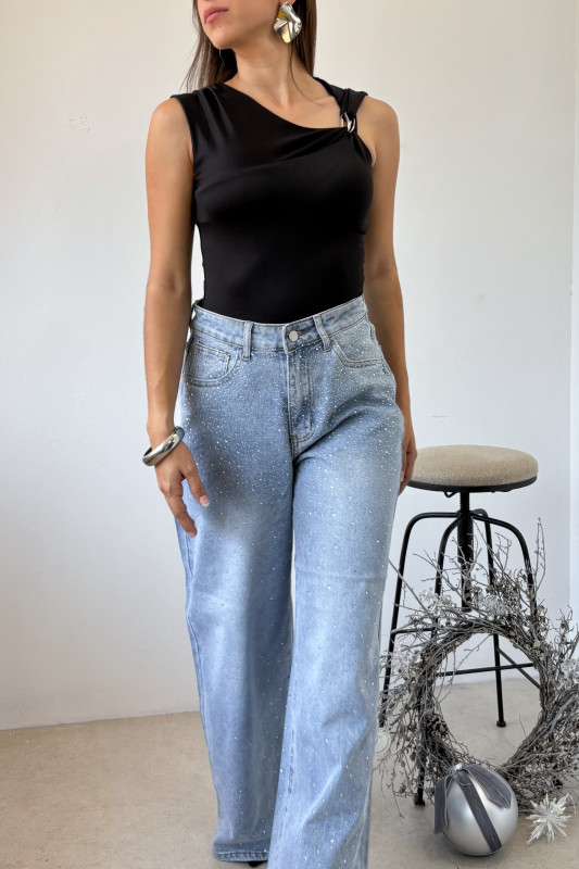 Body en corte semiajustado en doble tela, escote asimetrico y aplicación de hebilla metálica en hombro.