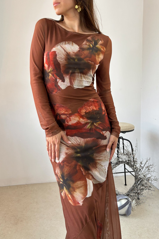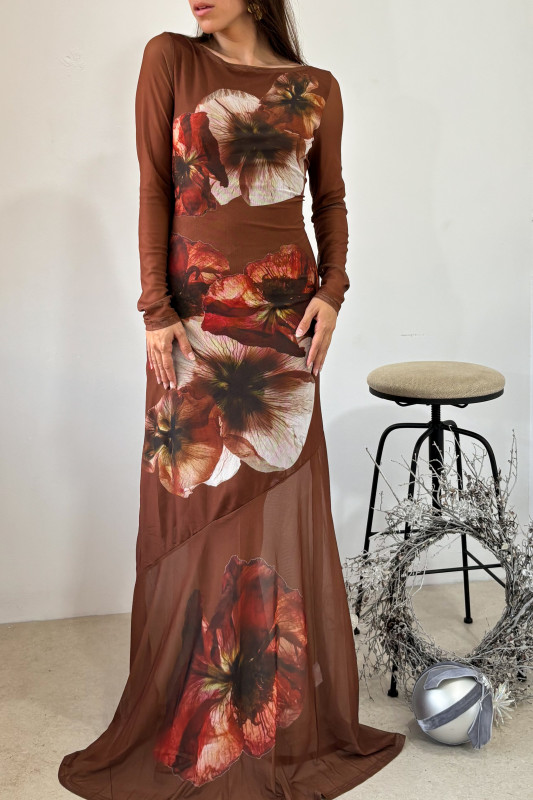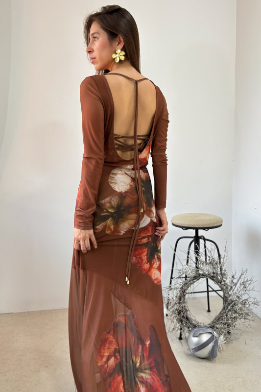 Vestido largo en mesh con estampados florales, corte semiajustado con falda en transparencia  y corte relajado; espalda con escote profundo y lazos ajustables a modo de corset.