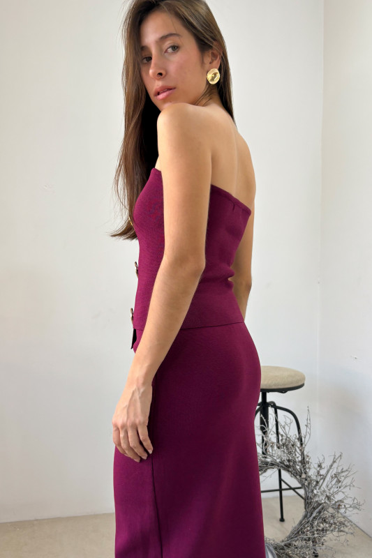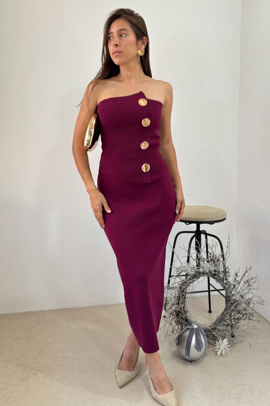 Set en dos piezas en tejido de punto fino; parte alta en top strapple con falsa solapa asímetrica y aplicaciones de botones dorados; falda corte ajustado y elástico oculto en cintura.