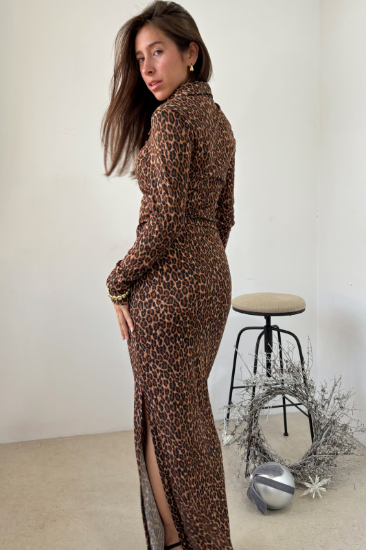 Set en dos piezas en tela ligera strech con estampado felino, blusa tipo polo con manga larga y botones al frente; falda largo midi con elástico en cintura y apertura alta en pierna.
