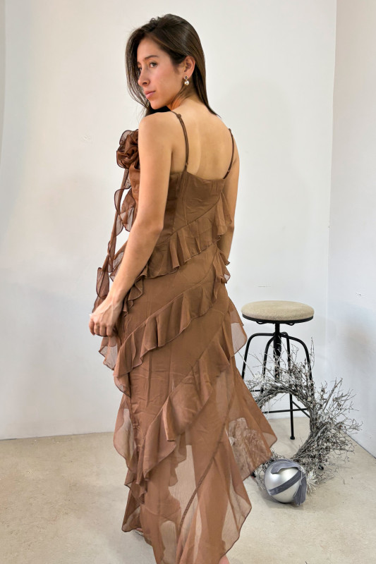 Vestido largo midi en corte asimetrico en tela ligera con escarolas fluidas; tirantes ajustables y aplicación de flor resaltada en misma tela.
