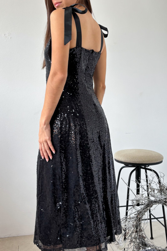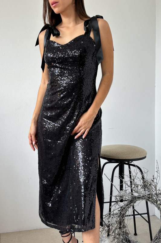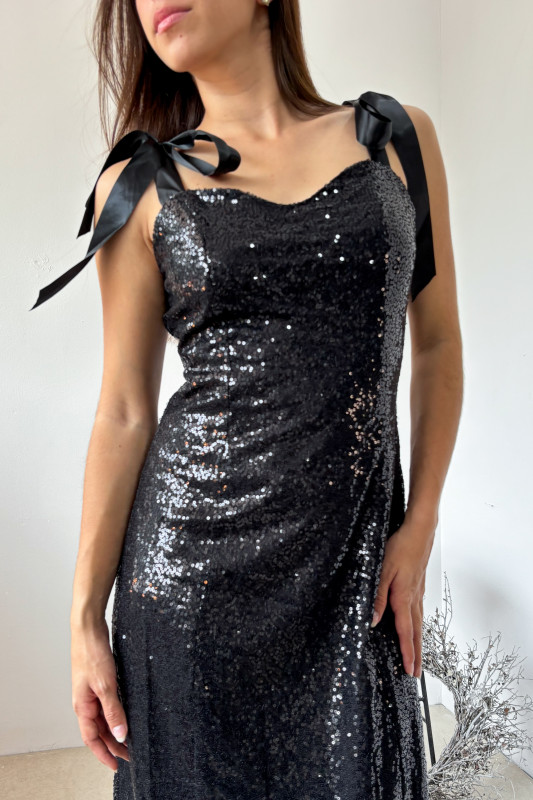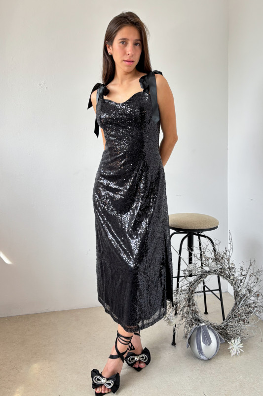 Vestido largo midi, corte semiajustado en lentejuelas ligeras, escote corazón, lazos ajustables y apertura alta en pierna.