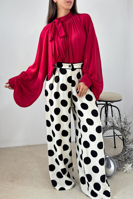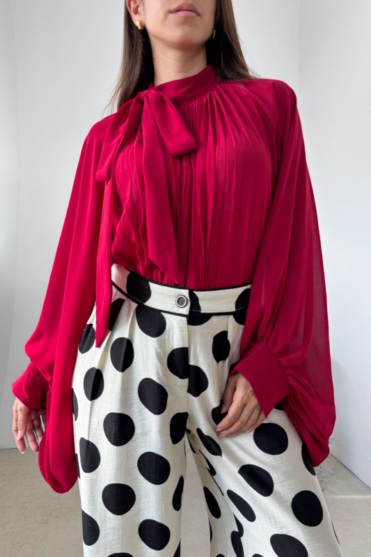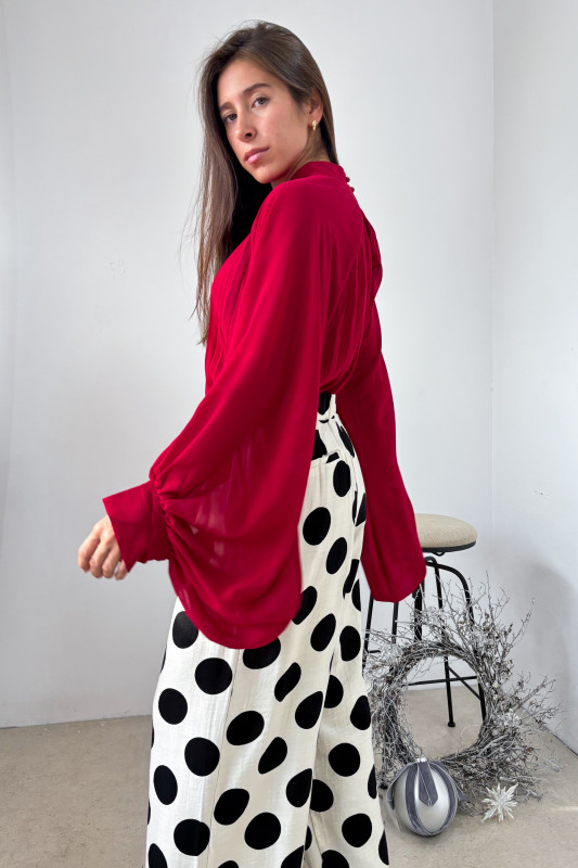 Blusa corte relajado en chiffon ligero con detalles de tableados al frente y en espalda, mangas tipo globo, puños anchos con botones de media perla y cuello cerrado con corbatero en misma tela.