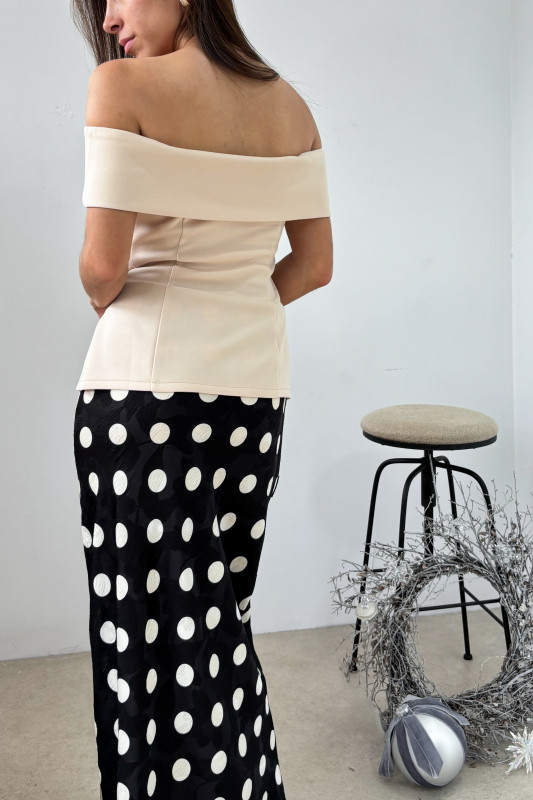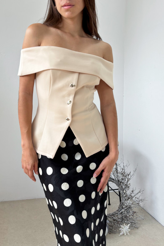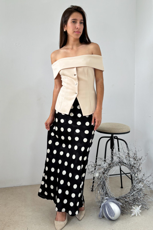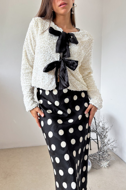 Falda midi en tejido ligero con textura floral en bajo relieve y contraste de lunares blancos y elástico oculto en cintura.
