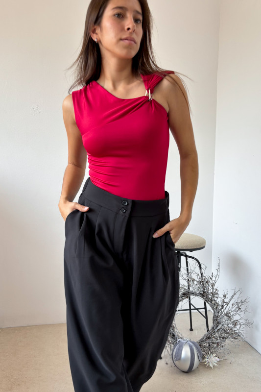Maxi pantalón en tela grosor medio, cintura definida con abotonadura al frente; pinzas largas y bolsas laterales.