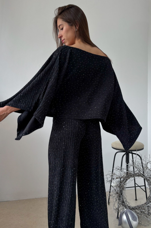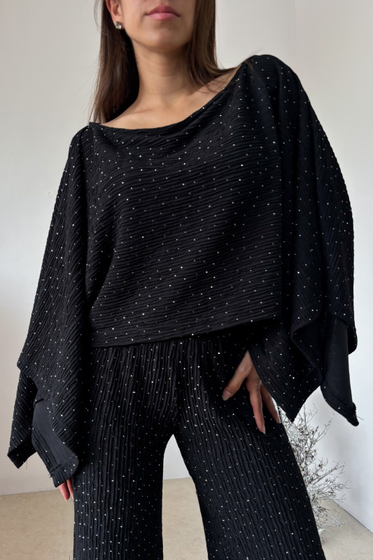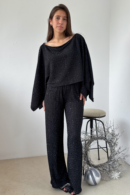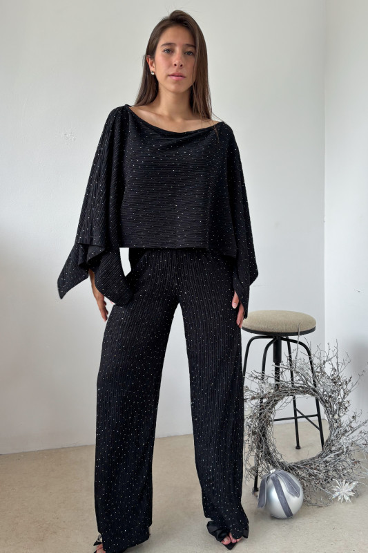Set en dos piezas en tela strech con textura acanalada y aplicaciones de brillantes, blusa corte mariposa con cuello amplio y mangas anchas; pantalón corte recto con elástico en ciuntura.