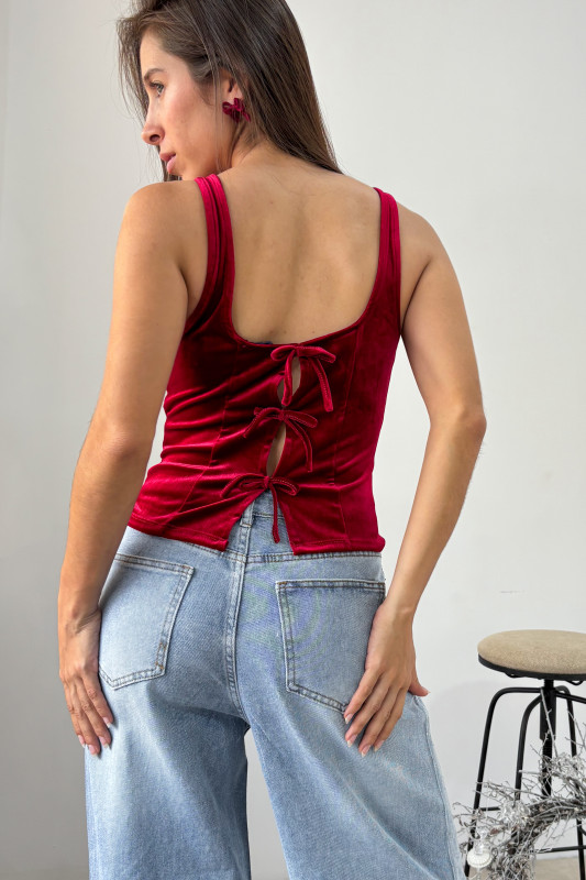 Blusa corta en terciopelo strech, corte semiajustado con escote cuadrado; espalda con aperturas y lazos no ajustables en misma tela.