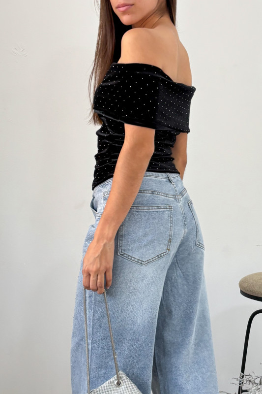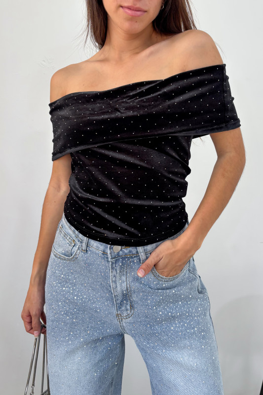 Blusa corta en terciopelo strech con aplicaciones de brillantes, escote de hombros descubiertos.