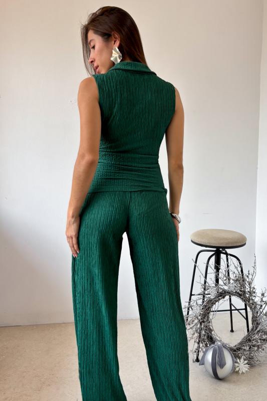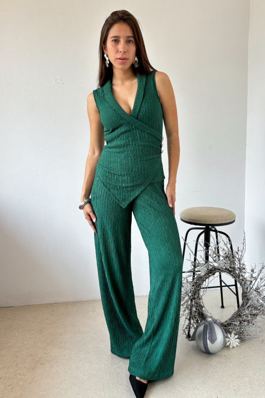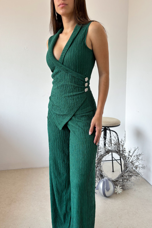 Set en dos piezas en tejido strech con textura, blusa corte semiajustado con efecto envolvente, escote V y aplicaciones de botones plateados, pantalón corte recto con tiro alto y elástico en cintura.