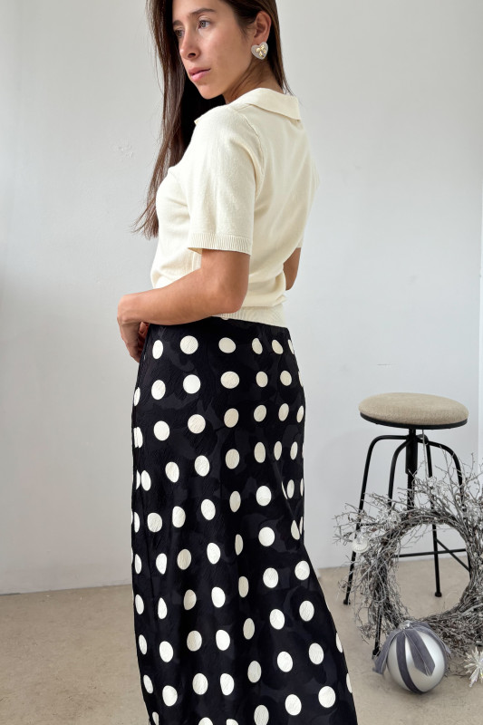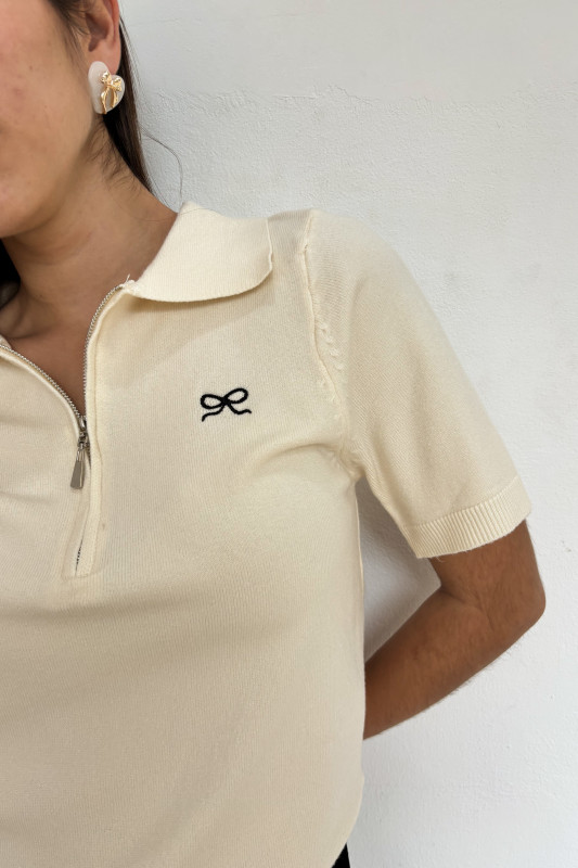 Blusa tipo polo en tejido de punto fino con cierre en cuello y bordado de lazo en contraste.
