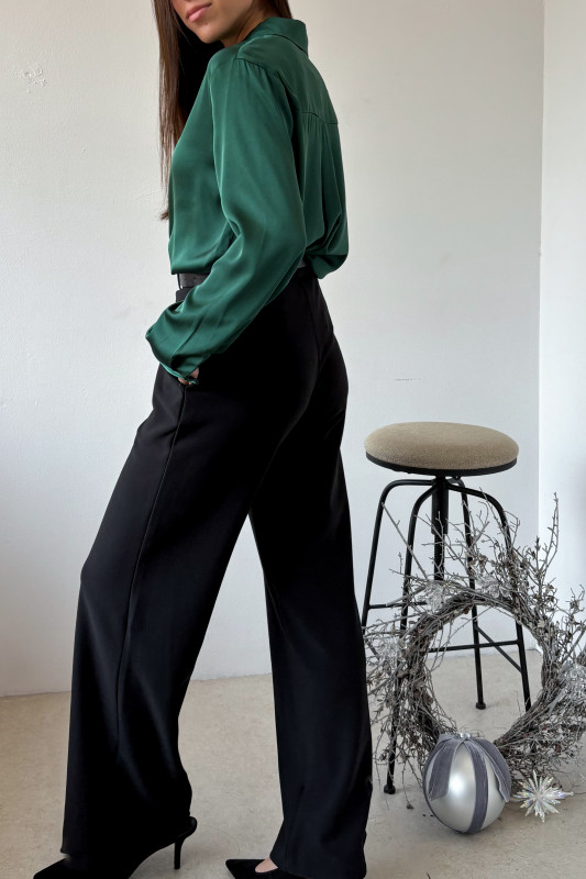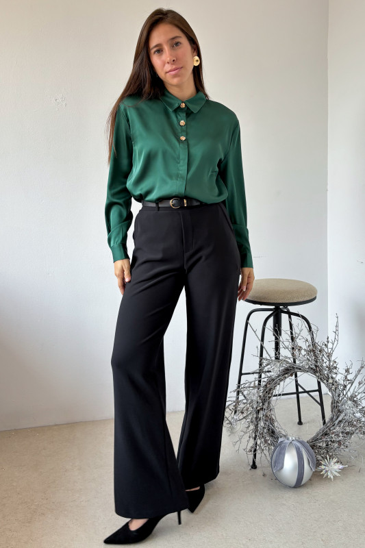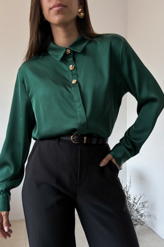 Camisera corte regular en tela satinada con solapa cubre botones y detalles de aplicaciones doradas en cuello.