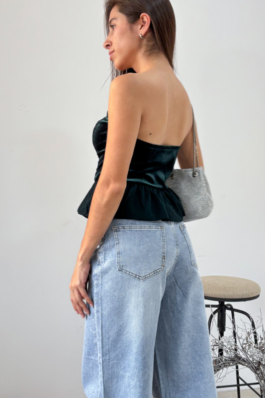 Blusa corte peplump en mezcla de terciopelo strech en parte alta y faldón en tela liegra.
