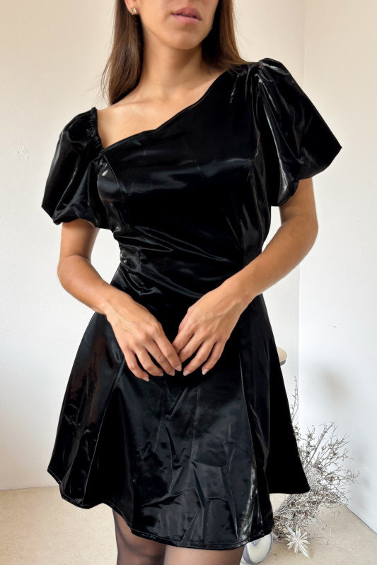 Mini vestido en látex strech, corte en línea A; conmangas tipo globo y escote asímetrico.
