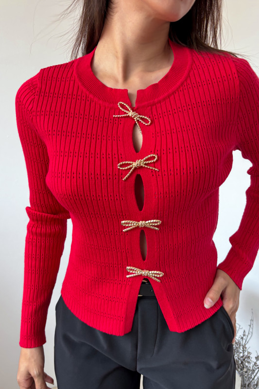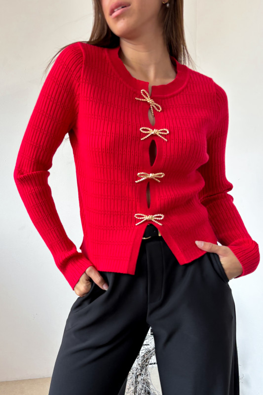 Blusa tipo abrigo en tejido de punto ancho con aperturas al frente y aplicaciones de falsos botones a modo de lazos dorados.