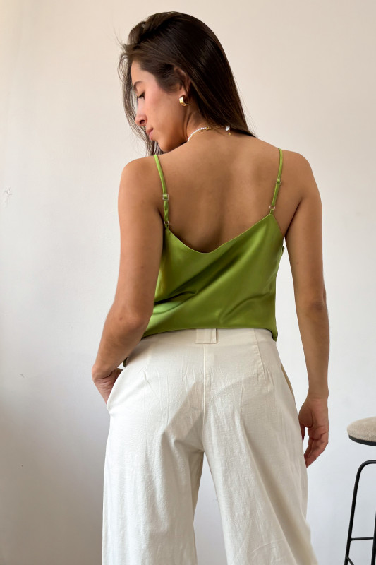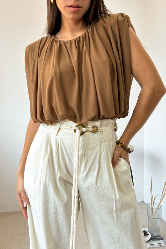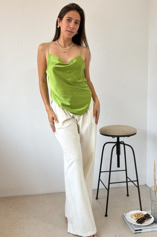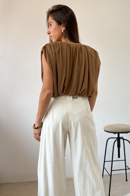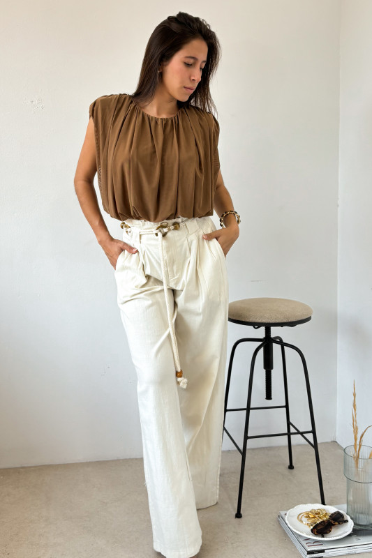 Pantalón corte recto en tejido ligero con precillas anchas, y cintillo de listón con cuentas de madera.