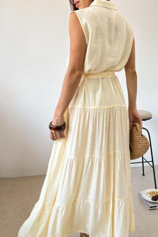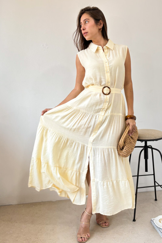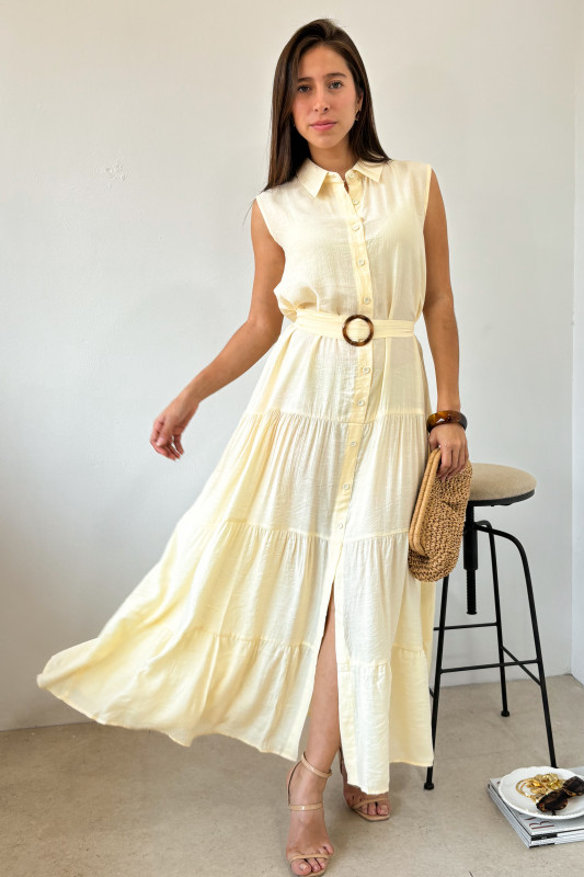 Maxi vestido en tela ligera con cuello tipo polo, botones al frente y cintillo ajustable en misma tela con hebilla en acrilico.