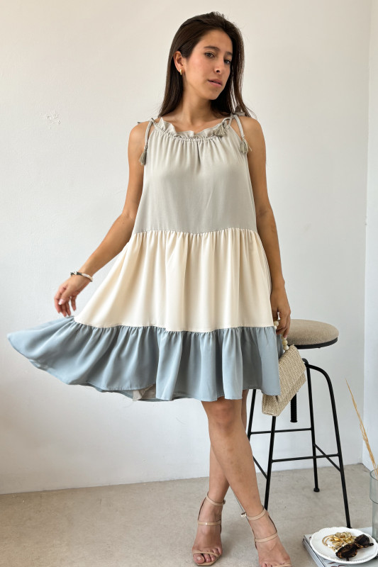 Vestido tipo batita en corte relajado en bloques de colores y lazos ajustables con borlas.