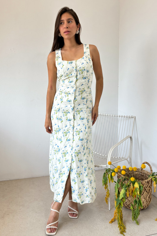 Vestido largo midi estampado floral, corte semiajustado con botones al frente y lazo ajustable en espalda baja.