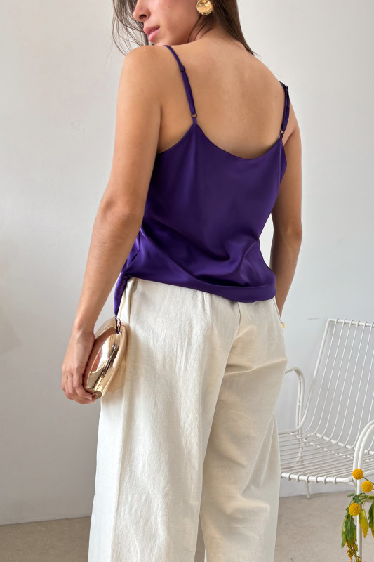 Blusa corte lencero en tela satinada con cuello tipo hamaca y tirantes ajustables.