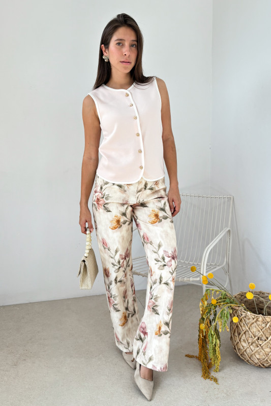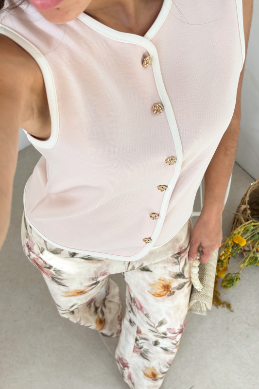 Chaleco corte relajado en tejido de punto fino con bordos en contraste y botones de flores doradas.