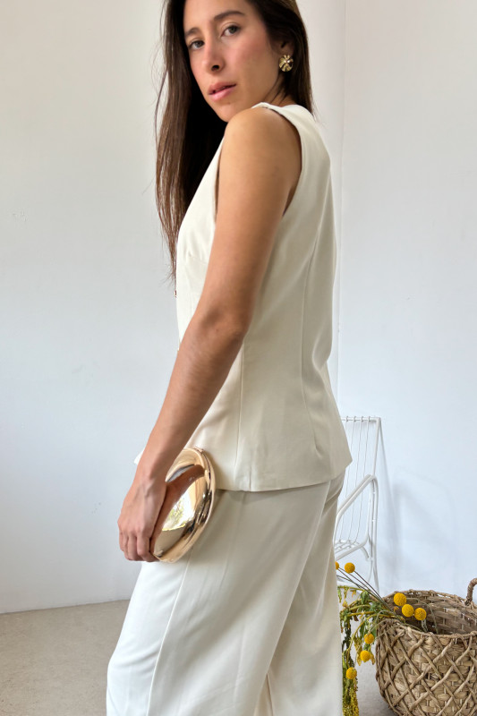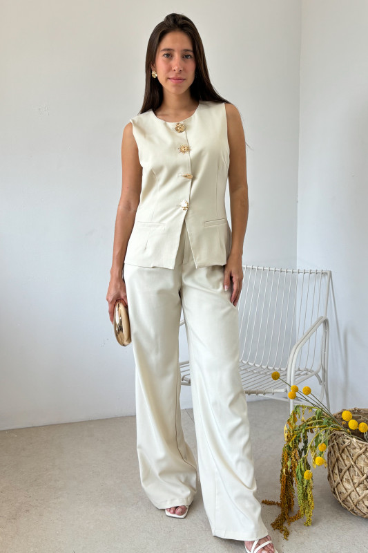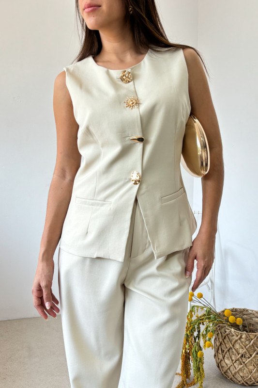 Set en dos piezas; chaleco en corte regular con botones dorados y pantalón tiro alto en corte regular con elástico en espalda.