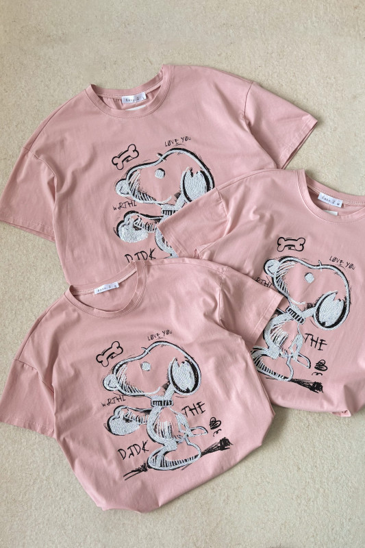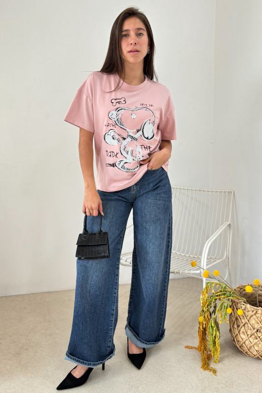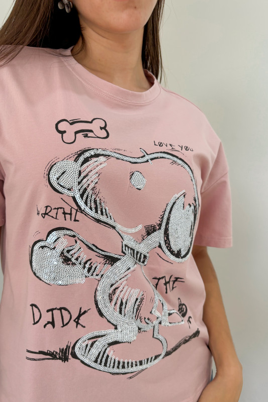 Playera corte relajado con estampado en contraste y aplicaciones de lentejuelas blancas.