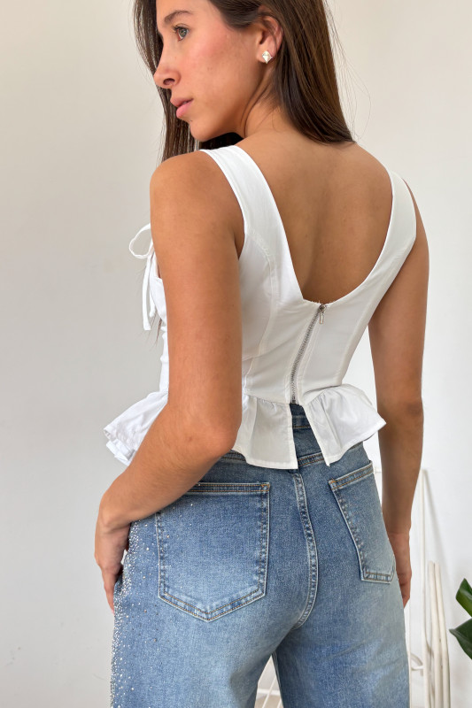 Blusa corte peplump en tela strech con escote corazón y copas, tirantes anchos con lazos ajustables.