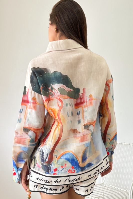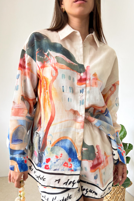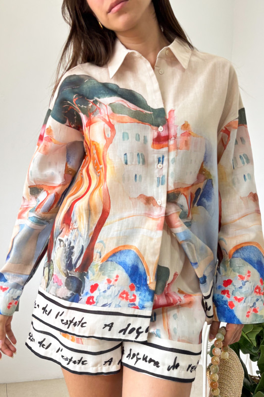 Set en dos piezas en tela ligera con estampados de colores y textos; camisera corte relajado con manga larga y botones en puños; short corto con elástico en cintura, bolsas laterales y forro.