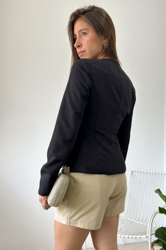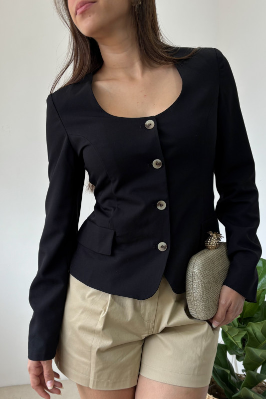 Blazer en corte semiajustado con cuello redondo amplio, botones en contraste y falsos bolsillos al frente.