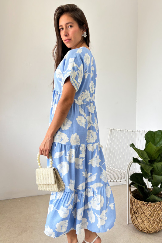 Maxi vestido en tela ligera con estampado floral, escote V mangas fluidas y detalles de bordados en contraste.